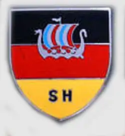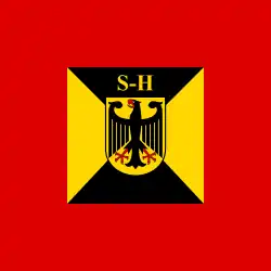 - „Von einer silbernen Kordel mit eingeflochtenem schwarzen Faden gefasst, geteilt zu Schwarz, Rot, Gold in goldenem Mittelschild ein einköpfiger schwarzer Adler, den Kopf nach rechts gewendet, die Flügel offen, aber mit geschlossenem Gefieder, Schnabel, Zunge und Fänge von roter Farbe (Bundesadler); der Mittelschild unten begleitet von Wort S H in schwarzen lateinischen Großbuchstaben.“