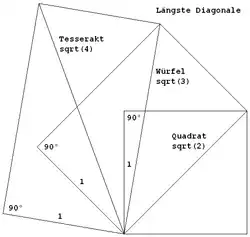 Die längste Diagonale eines Hyperwürfels entspricht der Quadratwurzel seiner Dimensionsanzahl multipliziert mit seiner Kantenlänge. Beim Tesserakt ist daher die längste Diagonale zwei Kantenlängen lang. Wenn man bei einem Tesserakt seine acht gegenüberliegenden Begrenzungswürfel paarweise miteinander verheftet, entsteht ein 4-Torus.