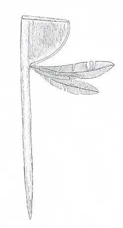 | Griffstück: | Walknochen, Holz, Federn |