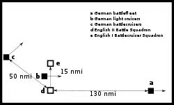 Kurz vor 16:00 Uhr trafen die Schlachtkreuzer der ersten Aufklärungsgruppe auf das unter der Befehlsführung von David Beatty stehende britische erste Schlachtkreuzergeschwader. Zwischen den gegnerischen Schiffen begann ein Artillerieduell, wobei die Indefatigable kurz nach 17:00 Uhr[22] und die Queen Mary kaum eine halbe Stunde später zerstört wurden.[23] Um diese Zeit dampften die deutschen Schlachtschiffe südwärts, um die britischen Schiffe in Richtung des Hauptverbands der Hochseeflotte zu lenken. Um 17:30 Uhr beobachtete die Mannschaft des führenden deutschen Schlachtschiffes, der König, wie die Schiffe der ersten Aufklärungsgruppe und des ersten Schlachtkreuzerverbands sich näherten. Die deutschen Schlachtschiffe fuhren auf die Steuerbordseite hin, wohingegen die britischen Schiffe sich backbordwärts bewegten. Um 17:45 Uhr erteilte Scheer den Befehl zur Wende in Richtung Backbordseite, damit seine Schiffe sich den britischen Schlachtkreuzern nähern konnten. Eine Minute später wurde der Schießbefehl ausgegeben.