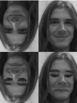 Der Effekt kann durch zwei ursprünglich identische Fotografien demonstriert werden, die beide um 180° gedreht sind, d. h. auf dem Kopf stehen. Dabei ist die zweite Fotografie in der Weise verändert, dass sowohl die Augen als auch der Mund innerhalb des Bildes noch einmal um 180° gedreht vorliegen. Beim ersten Hinsehen unterscheiden sich die beiden Fotografien kaum, erst wenn die Bilder richtig herum vorliegen, bemerkt man die groteske Veränderung.[2]