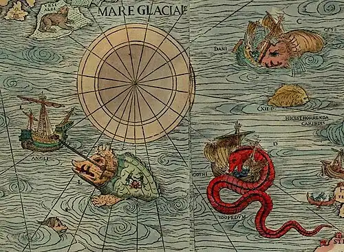 - ↑ Walter Scott: Minstrelsy of the Scottish Border. 2. Auflage. Edinburgh, 1802, Band III, S. 320: ‚They who in Works of Navigation, on the Coasts of Norway, employ themselves in fishing or Merchandise, do all agree in this strange story, that there is a Serpent there which is of a vast magnitude, namely 200 foot long, and more –– over 20 feet thick; and is wont to live in Rocks and Caves toward the Sea-coast about Berge: which will go alone from his holes in a clear night, in Summer, and devour Calves, Lambs, and Hogs, or else he goes into the Sea to feed on Polypus, Locusts, and all sorts of Sea-Crabs. He hath commonly hair hanging from his neck a Cubit long, and sharp Scales, and is black, and he hath flaming shining eyes. This Snake disquiets the Shippers, and he puts up his head on high like a pillar, and catcheth away men, and he devours them; and this hapneth not, but it signifies some wonderful change of the Kingdom near at hand; namely that the Princes shall die, or be banished; or some Tumultuous Wars shall presently follow.‘