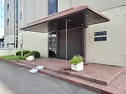 Eingangstür des Kyōto Fukushoku Bunka Kenkyū Zaidan mit Namensschild