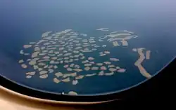 The World ist eine auf der Basis von Felsschüttungen aus verdichtetem Sand aufgespülte künstliche Inselgruppe in Dubai, Vereinigte Arabische Emirate, 4–10 km vor der Küste des Stadtteils Jumeirah.