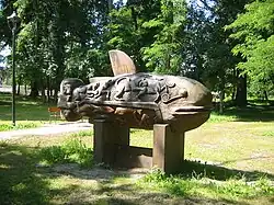 In der Mitte der bis zu 37 Meter breiten Insel befindet sich eine Skulptur von Julian Zapłatyński mit dem Titel „Goldschatz“. Sie zeigt einen aus einem Holzstamm gearbeiteten Fisch, der im Rahmen eines Bildhauerworkshops Insel der Phantasie entstand. Der Künstler will mit seinem Werk an den Goldschatz von Vettersfelde erinnern. Dieser Schatzfund aus dem Jahr 1882 besteht unter anderem aus einem Anhänger, einem Halsreif, einer Schwertscheide und einem Fisch. Teile des Schatzes gehören zu einer skythischen Rüstung, die um 500 v. Chr. datiert sind und sich heute im Alten Museum in Berlin befinden.
