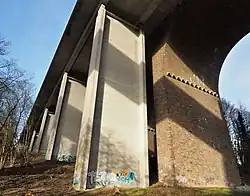 Die elf Brückenfelder von je 44 m Spannweite wurden mittels einer 560 t schweren Vorschubrüstung erstellt. Insgesamt wurden 14.000 m³ Beton und 1500 t Beton- sowie 280 t Spannstahl verbaut. Ein Teil der Pfeiler wurde auf bis zu 30 m tiefen Großbohrpfählen von 1,5 m Durchmesser gegründet.[11][12] Bis Mitte 1999 waren zwei Drittel des Überbaus betoniert.[13] Der Überbau wurde im November 1999 im Rohbau fertiggestellt.[4]