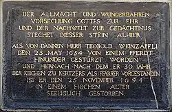 Gruner bemerkt, Weinzäpfli habe sich «ausgebetten», man möge zu seinen Lebzeiten kein Mahnmal errichten.[1] Aus der bernischen Bauherrenrechnung geht allerdings hervor, dass am 23. September 1693 dem Gipser Adam Fruting für eine Neufassung der «buchstaben, so zu gedechtnuß des über die kirchmauer herunter gefallenen predicanten Wynzäpfflins» ein Geldbetrag ausbezahlt wurde.[9] Der heute an der östlichen Mauer der Münsterplattform angebrachte, vermutlich aus Oberländer Kalkstein gefertigte Gedenkstein wurde 1734 durch den Marmorsäger Jean François Calame errichtet, die Inschrift durch den Flachmaler David Dick (1673–1760) vergoldet.[9] Am 25. April 1749 wies der Kleine Rat Altquästor Morlot an, es solle «der sogenannte Weinzäpffli Stein nicht weg gethan, wohl aber baß hinunder an Niveau der Maur gesezet werde.»[10]
