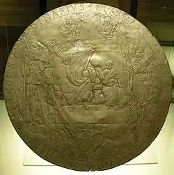 - ↑ Nennt das Theodosius-Missorium als berühmtestes Vergleichsobjekt: Achim Arbeiter: Der Kaiser mit dem Christogrammnimbus zur silbernen Largitionsschale Valentinians in Genf, in: Antiquité tardive 5 (1997) S. 153–167.