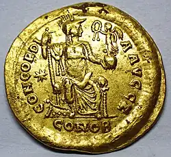 Nicht zur Außen-, sondern zur Innenpolitik zählten die Beziehungen zwischen Ostrom und der westlichen Reichshälfte, in der zunächst (bis 423) Theodosius’ Onkel Honorius und ab 425 sein Vetter Valentinian III. herrschten.[14] Die Kontakte blieben trotz mancher Spannungen am Anfang des 5. Jahrhunderts und unter Constantius III., der 421 sogar einen Bürgerkrieg gegen Theodosius vorbereitete, eng. Als nach Honorius' Tod der Usurpator Johannes in Ravenna das Kaisertum beanspruchte, schickte Theodosius Anfang 425 Truppen nach Italien, die Johannes besiegten und seinen sechsjährigen Vetter Valentinian im Herbst 425 als neuen Augustus des Westens etablierten. Theodosius, der offenbar vor der Usurpation geplant hatte, den Westen von Konstantinopel aus selbst zu regieren, sandte nun eigens seinen magister officiorum Helion nach Italien, um die Kaiserkrönung vorzunehmen. Valentinian III. wurde einige Jahre später zudem Theodosius' Schwiegersohn und besuchte anlässlich der Heirat mit Licinia Eudoxia 437 persönlich Konstantinopel, um gemeinsam mit Theodosius aufzutreten und die Eintracht beider Reichshälften zu demonstrieren. Bei dieser Gelegenheit gab der Westen auch seine Ansprüche auf das seit Jahrzehnten zwischen den beiden Kaiserhöfen umstrittene Illyricum auf, das damit endgültig an den Osten fiel.