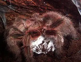 Grammostola rosea, Weibchen mit Kokon | ||||||||||||