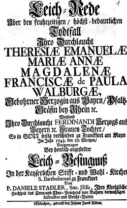 Kaiser Karl VII. betrauerte beide in einem Brief vom 29. März 1743, an seinen Bruder, Bischof Johann Theodor von Bayern.[7]