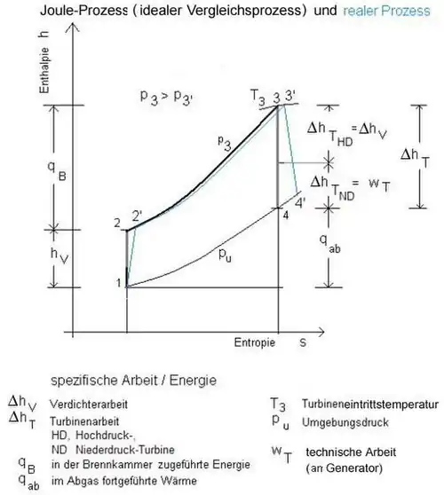Es kann stattdessen auch sein (siehe das folgende Beispiel), dass der geschlossene Weg in verschiedene Abschnitte zerfällt, auf denen verschiedene Zustandsfunktionen betrachtet werden (z. B. erfolgen beim nächsten Beispiel Entropie-Änderungen bei horizontalen Abschnitten, dagegen Enthalpie-Änderungen auf vertikalen Abschnitten). Das Resultat ist i. A. die Erzeugung einer mechanischen oder elektrischen Arbeit (z. B. Dampfturbine).