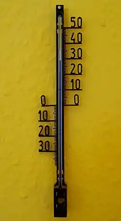 Ab etwa 1714 ersetzte Daniel Gabriel Fahrenheit in Amsterdam den Alkohol durch Quecksilber und erfand das Quecksilberthermometer. 1702 entwickelte der dänische Astronom Ole Rømer eine Skala mit zwei Fixpunkten.[9] 1724 schlug Daniel Gabriel Fahrenheit die nach ihm benannte Temperaturskala vor, die den kältesten Punkt einer Kältemischung als 0 °F, den Schmelzpunkt von Wasser als 32 °F und die Körpertemperatur des Menschen als 96 °F definierte. Anders Celsius legte seine Skala 1742 anhand von Schmelz- und Siedepunkt von Wasser fest, allerdings andersherum als die heute nach ihm benannte Skala.