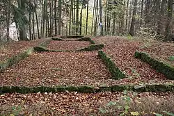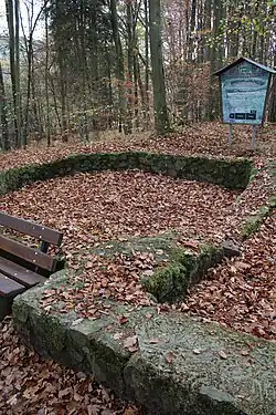Am westlichen Ende der Südseite war ein kleiner Anbau nur von außen zugänglich. Aufgrund einer Herdstelle wird er als Klause der Teutbirg gedeutet.[6]