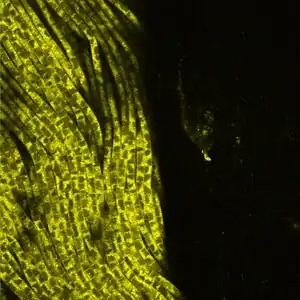 Die LSM-Aufnahme von Thioploca sp. zeigt die Autofluoreszenz der an sich farblosen Bakterien | ||||||||||
