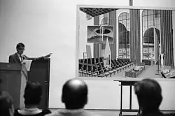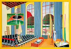 Thomas Huber ist ein Künstler, der Text und Bild in Zusammenhang bringt und zu seinen Bildern redet. Seine Bildauffassung setzt er in den Bereichen Malerei, Aquarell, Zeichnung, Objekt, Druckgrafik, Kunst am Bau, Künstlerrede und Künstlerbuch um. Das Bild Rede in der Schule zeigt die Aula im Hauptgebäude der Kunstakademie Düsseldorf.
