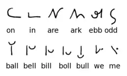 Die Vokale wurden durch die Höhe des nachfolgenden Konsonanten bezeichnet. So bedeutete das B-Symbol mit direkt darüber geschriebenen L-Symbol „ball“, während das B-Symbol mit dem L-Symbol darunter „bull“ bedeutete. Das B-Symbol mit dem L-Symbol oben rechts bedeutete „bell“, rechts mittig „bill“, unten rechts „boll“. Ein Vokal am Wortende wurde durch einen Punkt in der entsprechenden Position bezeichnet. Für Anfangsvokale gab es zusätzliche Symbole. Weitere Symbole für häufige Vor- und Nachsilben sowie für Konsonantenverbindungen kamen hinzu.