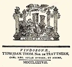 Verlagszeichen von Trattner, mit Leitspruch „Altius labore et favore“