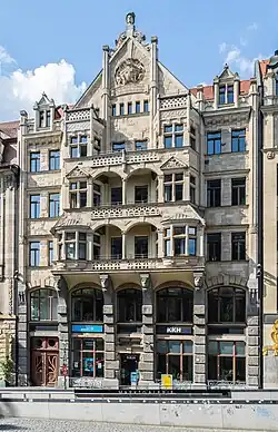 Auf dem mittleren Grundstück (Nr. 21) erbaute der Maurermeister Friedrich Moritz Lindner nach Plänen des Leipziger Architekten Albin Conrad 1903/1904 ein Geschäftshaus. Bauherr dürfte der Erstbesitzer der Immobilie, der Kaufmann J. M. Barthel, gewesen sein.[2] In seinem Besitz beziehungsweise dem seiner Erben blieb das Haus, bis es 1923 der Fabrikbesitzer Max von Bleichert für drei Jahre erwarb. Nach einer Preußischen Grundstücks-GmbH folgte 1933 die Kaufmännische Krankenkasse[3], die, nach der gegenwärtigen Nutzung des Ladenlokals zu urteilen, nach der Enteignung nach dem Zweiten Weltkrieg wieder Besitzer des Hauses ist.