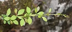 Die unterseits hellgrünen und kurz gestielten, abgerundeten bis stumpfen, manchmal stachelspitzigen, ledrigen, kahlen Laubblätter sind verkehrt-eiförmig, spatelförmig, ganzrandig und etwa 1 bis 3 cm lang. Ihre Herbstfärbung reicht von leuchtend orange bis hin zu karminrot. Die Blattdornen sind meist einfach und 5 bis 15 mm lang.