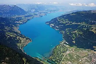 | Der Thunersee von Ostsüdosten aus der Luft gesehen | ||