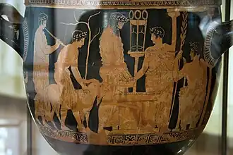Ab der zweiten Hälfte des 6. Jahrhunderts v. Chr. liefert die Ikonographie reiches Material an Darstellungen von Opfern. Im 6. und 5. Jahrhundert sind es vor allem die erhaltenen Vasen, während im 4. Jahrhundert die Reliefs überwiegen. Die überwiegende Mehrheit beider Quellen stellen Thysiai dar.[60]