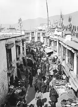 Hauptverkehrsmittel waren Maultiere, neben Pferden, Ponys, Eseln und Yaks, auf einigen Routen im Norden kamen auch Kamele zum Einsatz. Nur einzelne, kurze Strecken waren für Fahrzeuge passierbar. Moderne Straßen, die für den Kraftverkehr geeignet gewesen wären, waren nur in winzigem Umfang vorhanden.[42] Im ganzen Land soll es nur zwei Kraftfahrzeuge gegeben haben, die der 13. Dalai Lama in den 1920er Jahren zerlegt auf Yaks importieren ließ, um sie als Dienstwagen zu nutzen.[5]