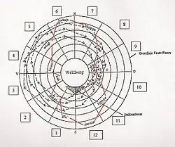 Tatsächlich entsprechen diese Sektoren der Projektion von senkrecht zum Himmelsäquator verlaufenden Großkreisen auf die Erdoberfläche und bilden damit zusammen mit sechs konzentrischen Kreisringen, die um den Weltberg verlaufen, ein Koordinatensystem zur Beschreibung des wahren Sonnenortes zu einem beliebigen Zeitpunkt.