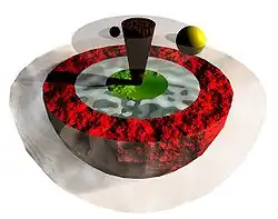 Aus der ebenen Schnittfläche dieser Halbkugel ragt inmitten des aus Erde bestehenden Kerns der 100.000 dpag tshad (ca. 1.450.000 km) hohe, runde Weltberg (tib.: ri rab, lhun po) empor. Die Übernahme des indischen Weltbergs Meru besitzt an der Basis einen Durchmesser von 16.000 dpag tshad (ca. 232.000 km) und verbreitert sich zum Gipfel, wo er einen Durchmesser von 50.000 dpag tshad (725.000 km) hat.