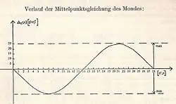 Anhand der Tafel der Mittelpunktsgleichungen errechnet sich die Korrekturgröße für die Länge eines mittleren lunaren Tages mit der folgenden Gleichung: