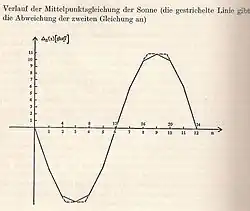 Anhand dieser Tafel der Mittelpunktsgleichungen errechnet sich die Korrekturgröße für die mittlere ekliptikale Länge der Sonne mit der folgenden Gleichung: