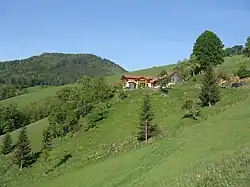 Der Haltgraben Richtung Süden, im Zentrum Tiefgrabenrotte 9 (vulgo Leiten), im Hintergrund der Frankenfelsberg | |||