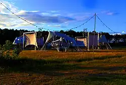 Das Bühnenbild mit den zelt- und segelhaften Elementen verbindet den archaischen Charakter eines Nomadendorfes mit der utopischen Vorstellung einer Weltraumsiedlung und erzeugt einen geschlossenen Rahmen für die Zuhörer, lässt aber gleichzeitig Lücken zur Wahrnehmung des Umfeldes offen.