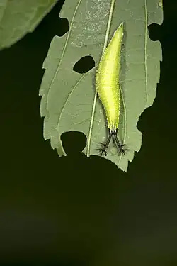 Die nacktschneckenförmigen hellgrünen Raupen sind mit zwei schwarzen, verzweigten, stacheligen Kopfhörnern ausgestattet, die sie zur Verteidigung gegen Fressfeinde einsetzen. Sie haben außerdem ein gegabeltes Hinterleibsende.