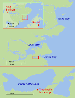 Bei seiner Alaska-Expedition im Jahr 2003 wurde Treadwell von seiner Freundin Amie Huguenard (* 23. Oktober 1965)[5] begleitet. Die Arzthelferin aus Aurora (Colorado) hatte auch schon in den beiden vorigen Jahren mehrere Wochen mit Treadwell in Alaska verbracht. Wie üblich brach Treadwell sein Camp Ende September ab, diesmal am 26. September. Weil sich aber in Kodiak ein Problem mit den Rückflugtickets nach Kalifornien ergab, kehrten er und Amie Huguenard am 29. September „für ein paar Tage“ ins Reservat zurück.[6] In seinem Tagebuch notierte Treadwell, er hasse die Zivilisation. Am 4. oder 5. Oktober kontaktierte er per Satellitentelefon Palovak und den Buschpiloten Willy Fulton, mit dem er die Abholung für den 6. Oktober, 14:00 Uhr vereinbarte.[7] Treadwell wählte seinen Campingplatz in der Nähe eines Lachsstroms, wo Grizzlys im Herbst gewöhnlich auf Nahrungssuche gehen. Zu dieser Zeit kämpfen Bären, um so viel Fett wie möglich vor dem Winter zu gewinnen; eine begrenzte Nahrungsversorgung macht die Bären naturgemäß aggressiver als in anderen Monaten. Die Nahrungsknappheit führte dazu, dass sich auch Bären von anderen Teilen des Parks in dem Bereich bewegten, was die Bären noch aggressiver als üblich machte, zumal diese Treadwell nicht kannten.[8]