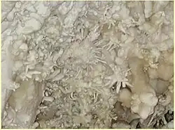 Im Kalkgestein finden sich sowohl an der Oberfläche, wie in Teilen der Höhle Fossilien von Rugosa, Haarsternen und Armfüßern.
