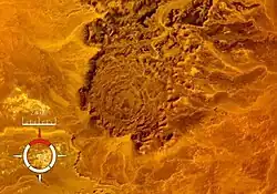 Der Krater hat einen Durchmesser von sechs Kilometern; sein Alter wird auf weniger als 70 Millionen Jahre geschätzt. Er ist an der Erdoberfläche sichtbar.