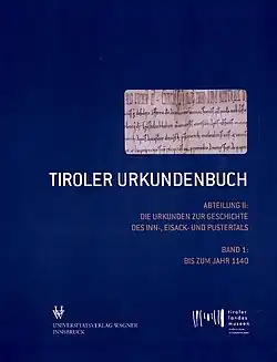In den Jahren 1937–1957 bearbeitete der Südtiroler Historiker Franz Huter die Erste Abteilung des Tiroler Urkundenbuches. Diese bietet die historisch-kritische Edition der Geschichtsquellen des Raumes um Bozen und Meran, insbesondere des Vinschgaus, des Burggrafenamts, Überetsches und Bozner Unterlands bis Salurn. Diese Gebiete waren Teil der Diözesansprengel der Bischofskirchen von Trient und Chur und stellten einen zentralen Übergangsraum zwischen den deutsch- und italienischsprachigen Gebieten des römisch-deutschen Reichs dar.[2]
