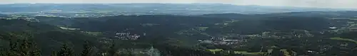 Im Norden ist die Aussicht durch den Erzgebirgskamm gehemmt. Im Osten sieht man Fichtelberg, Keilberg und den durch seinen Turm besonders auffälligen Pleßberg, rechts davon den Wölfling (Vlčinec, 973 m). Im Süden liegt nahe unterhalb des Bergs Nejdek. In der ausgedehnten nordböhmischen Ebene fallen Karlsbad und Chodov auf, in der Ferne sieht man die Ausläufer des Böhmerwaldes. Im Westen reicht die Sicht bis Eger und zum Fichtelgebirge.