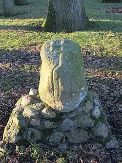 Das kleine Steinmal auf einem Rollsteinsockel, trägt im unteren seitlichen Bereich ein gabelähnliches Gebilde und auf der Oberseite eine stark abgewitterte, quadratförmige Darstellung von vier Kreuzen.