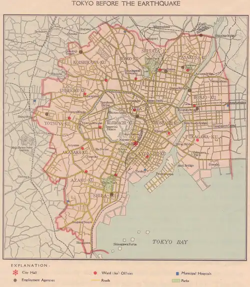 1932 wurden 82 Gemeinden aus fünf Landkreisen in die Stadt Tokio eingemeindet, das erweiterte Stadtgebiet wurde auch als Dai-Tōkyō (大東京), „Groß-Tokio“, bezeichnet. Die Fläche der Stadt Tokio wuchs von 80,5 auf 478,6 km², die Einwohnerzahl von rund 2,1 auf 5,4 Millionen (Einwohnerzahlen von 1933).[1] Das eingemeindete Gebiet wurde in 20 neue Stadtbezirke eingeteilt: