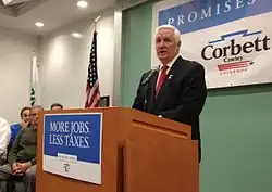 Während des Wahlkampfes im Herbst 2010 schloss Corbett Steuererhöhungen für Bürger und Unternehmen aus. Durch die Senkung von Steuern und Deregulierung solle ein wirtschaftsfreundlicheres Klima geschaffen werden, um so Wirtschaftswachstum zu fördern und die Arbeitslosigkeit zu senken. Auch forderte er eine Begrenzung der Staatsausgaben (fiskalpolitische Disziplin, u. a. „schlanker Staat“), um so den Staatshaushalt ausgleichen zu können.[17] In den Meinungsumfragen vor dem Urnengang lag Corbett stets mit unterschiedlichen Abständen in Führung.[18][19]
