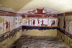 Die Grabkammer hat ein Giebeldach mit einem mittleren roten Streifen. An den Schmalseiten der Grabkammer ruht dieser im Giebelfeld auf roten Stützen. Auf der Rückwand sieht man links und rechts davon jeweils einen Löwen und auf der anderen Seite einen Panther. Die Wände der Grabkammer sind mit diversen Figuren ausgemalt. Der Figurenfries wird oben und unten jeweils von einem Farbband gerahmt. Auf der Rückwand sieht man links einen Mann auf einem Klappstuhl sitzend. Es handelt sich vielleicht um den Toten. Vor ihm sieht man Gaukler. In der Mitte steht eine junge Frau mit einem Kandelaber auf dem Kopf. Vor ihr steht ein Knabe, der einen Ring oder Ball in jeder Hand hält. Neben ihm stehen zwei Körbe. Hinter der jungen Frau sieht man einen Flötenspieler und hinter diesem einen nackten Mann und zwei Kinder. Auf der linken Wand sieht man ganz rechts einen Mann hinter einem Baum, wie er seinen Stuhlgang verrichtet. Eine Inschrift kommentiert diese Szene. In der Mitte der Wand sieht man einen alten Mann mit einem Stab, der sich auf einen nackten Jüngling stützt. Vor den beiden sieht man einen weiteren nackten Jüngling. Ganz links sieht man einen weiteren nackten Jüngling mit einem Pferd. Dieser Teil der Wand ist jedoch stark beschädigt. Die rechte Wand zeigt eine Gruppe von Tänzern. In der Mitte steht ein Musiker mit einer Panflöte. Seine Figur ist stark beschädigt. Links und rechts von ihm befinden sich jeweils zwei Tänzerinnen.