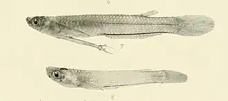Tomeurus gracilis, oben ein Männchen, unten ein Weibchen, Abbildung aus The freshwater fishes of British Guiana von Carl H. Eigenmann | ||||||||||||