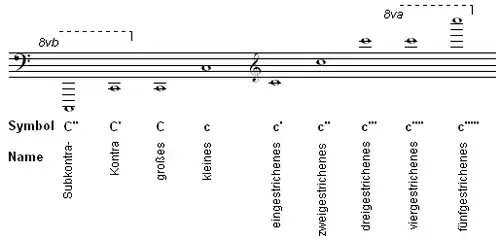 Die Tonbezeichnung allein (z. B. c) gibt noch keine Auskunft über die absolute Tonhöhe, da diese vom Oktavraum, in der der Ton liegt, sowie von der verwendeten Stimmung abhängt. Zur eindeutigen Benennung hat jeder Oktavraum eine eigene Bezeichnung. Dabei definiert die moderne Einteilung des musikalisch verfügbaren Tonraumes in Oktavräume die Tonkategorie C als Anfangston jeder Oktave. Die Töne der tieferen Oktaven werden mit Großbuchstaben, die der höheren mit Kleinbuchstaben bezeichnet (siehe Abb.); für jede höhere oder tiefere Oktave wird außerdem ein Strich hinzugesetzt. Statt der Striche können die Tonbuchstaben beziffert (c′ = c1) oder, in den tiefen Oktaven, auch verdoppelt werden (‚C = C1 = CC). In der gesprochenen Form wird dem Tonnamen die Bezeichnung der Oktave vorangestellt (z. B. „großes d“ für D, „eingestrichenes g“ für g′ ).