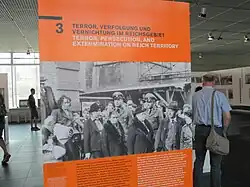 Im Dokumentationszentrum wird die Dauerausstellung Topographie des Terrors. Gestapo, SS und Reichssicherheitshauptamt in der Wilhelm- und Prinz-Albrecht-Straße auf einer Fläche von 800 m² präsentiert. Im Mittelpunkt der deutsch- und englischsprachigen Ausstellung stehen die zentralen Institutionen von SS und Polizei im „Dritten Reich“ sowie die von ihnen europaweit verübten Verbrechen. Neben der Darstellung des Terrorsystems nimmt die Berücksichtigung zahlreicher Opfergruppen des NS-Regimes einen wichtigen Stellenwert ein.[28]