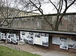 Der Ausstellungsgraben entlang der freigelegten Kellermauerreste und entlang des Baudenkmals Berliner Mauer an der Niederkirchnerstraße wird für Präsentationen im Freien genutzt. Hier wird eine deutsch- und englischsprachige Dauerausstellung Berlin 1933–1945. Zwischen Propaganda und Terror gezeigt, die die historische Rolle Berlins als Hauptstadt des „Dritten Reichs“ thematisiert.[29]