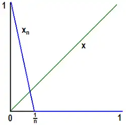 • In der Funktionenalgebra der stetigen Funktionen auf dem Einheitsintervall [0,1] mit der Supremumsnorm ist ein topologischer Nullteiler, der kein Nullteiler ist. ist kein Nullteiler, denn ist , so muss zunächst für gelten, da auf nicht 0 ist. Die Stetigkeit von liefert dann für alle die Eigenschaft und damit muss (also die Nullfunktion auf ) sein und ist kein Nullteiler.
