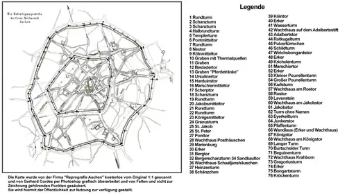 1810 Abriss bis zur Mauerkrone, 1850 vollständig abgerissen | stabilster Wehrturm Aachens | |