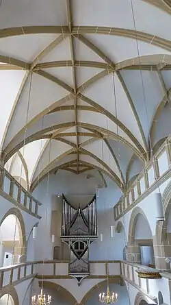In dem Saal zu drei Geschossen stehen zwei umlaufende Emporen aus Stein. Die Gewölbe sind Stern- und Netzgewölbe.[7] Die Halle ist 23 Meter lang, 11 Meter breit und etwa 14 Meter hoch. Bevor die Kirche am 31. Oktober 1930 zur Luther-Gedächtniskirche gewidmet wurde, fand eine umfangreiche Renovierung statt.[10]